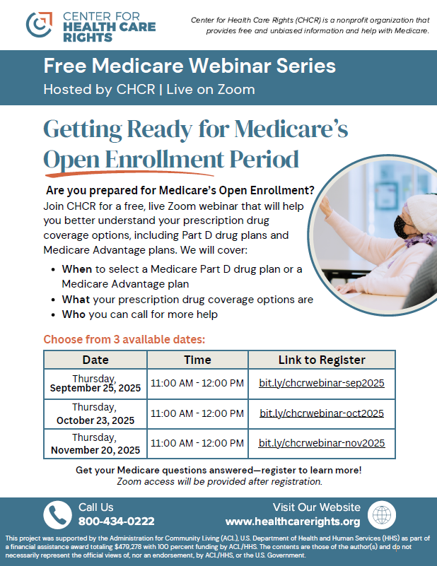 We help people understand their health care options so that they can make informed choices about their Medicare coverage. The Center for Health Care Rights does not endorse or recommend specific insurance products.